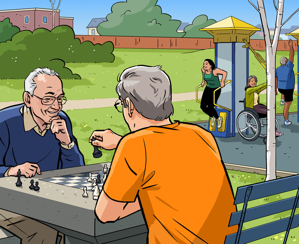 Illustrations for Renaissance Magazine’s fitness column by Ylva Van Buuren, all with AD Josiah Gordon. From top to bottom: "Make Your Own Summer Camp", "Your Guide to Nordic Walking", and "Get Crokicurling".